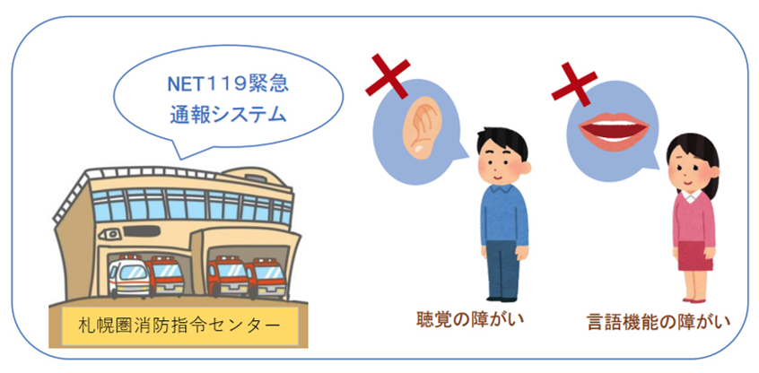 NET119緊急通報システムはスマートフォン等からインターネットを利用して119番通報を行うことができるサービスです。聴覚、言語機能に障がいがあるなど、会話の不自由な方が、スマートフォン等により、いつでも全国どこからでも通報場所を札幌圏消防指令センターへ音声によらない通報をできるサービスです。