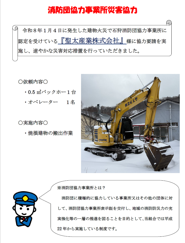 災害現場で消防団協力事業所にご協力を頂きました 石狩 お問い合わせ先 石狩消防署 総務課 〒061-3211 北海道石狩市花川北1条1丁目2番地3 TEL:0133-74-7112 FAX:0133-74-9814